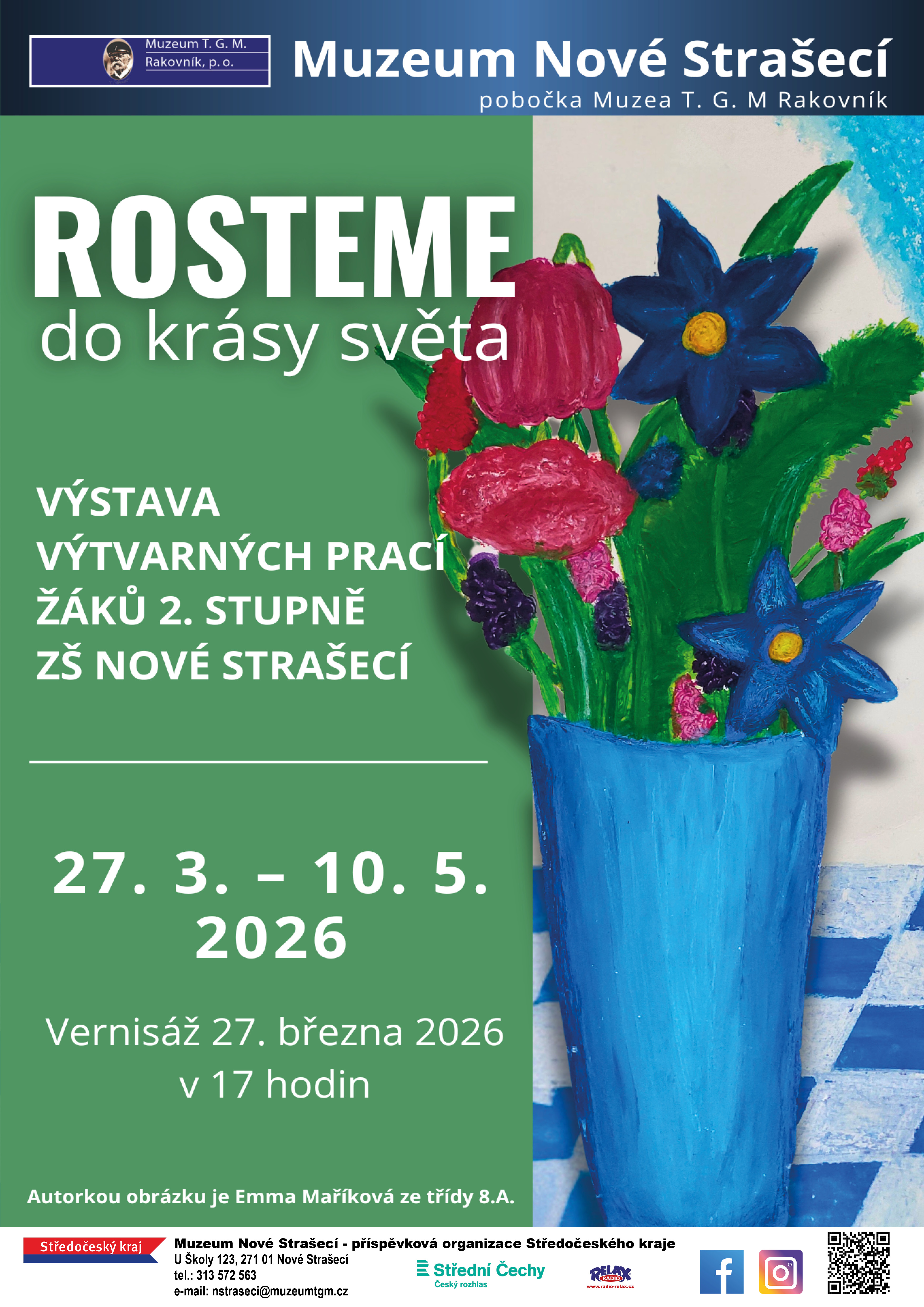 Také vám lezou puberťáci a jejich kousky na nervy? Připadá vám, že z nich nic kloudného nevyroste? Ptáte se, kde jsme jako dospělí udělali chybu? Přijďte se podívat do Muzea v Novém Strašecí, jak naši „puberťáci“ rostou a vnímají krásy i neduhy okolního světa. Budete ujištěni, že pod tou drsnou a drzou slupkou „puberťáka“ se často skrývá krásná a křehká duše mladého člověka. Nevěříte? Navštivte výstavu výtvarných prací žáků 2. stupně ZŠ v Novém Strašecí „ROSTEME do krásy světa“, na jejíž slavnostní zahájení v pátek 27. března 2026 v 17 hodin vás srdečně zveme.