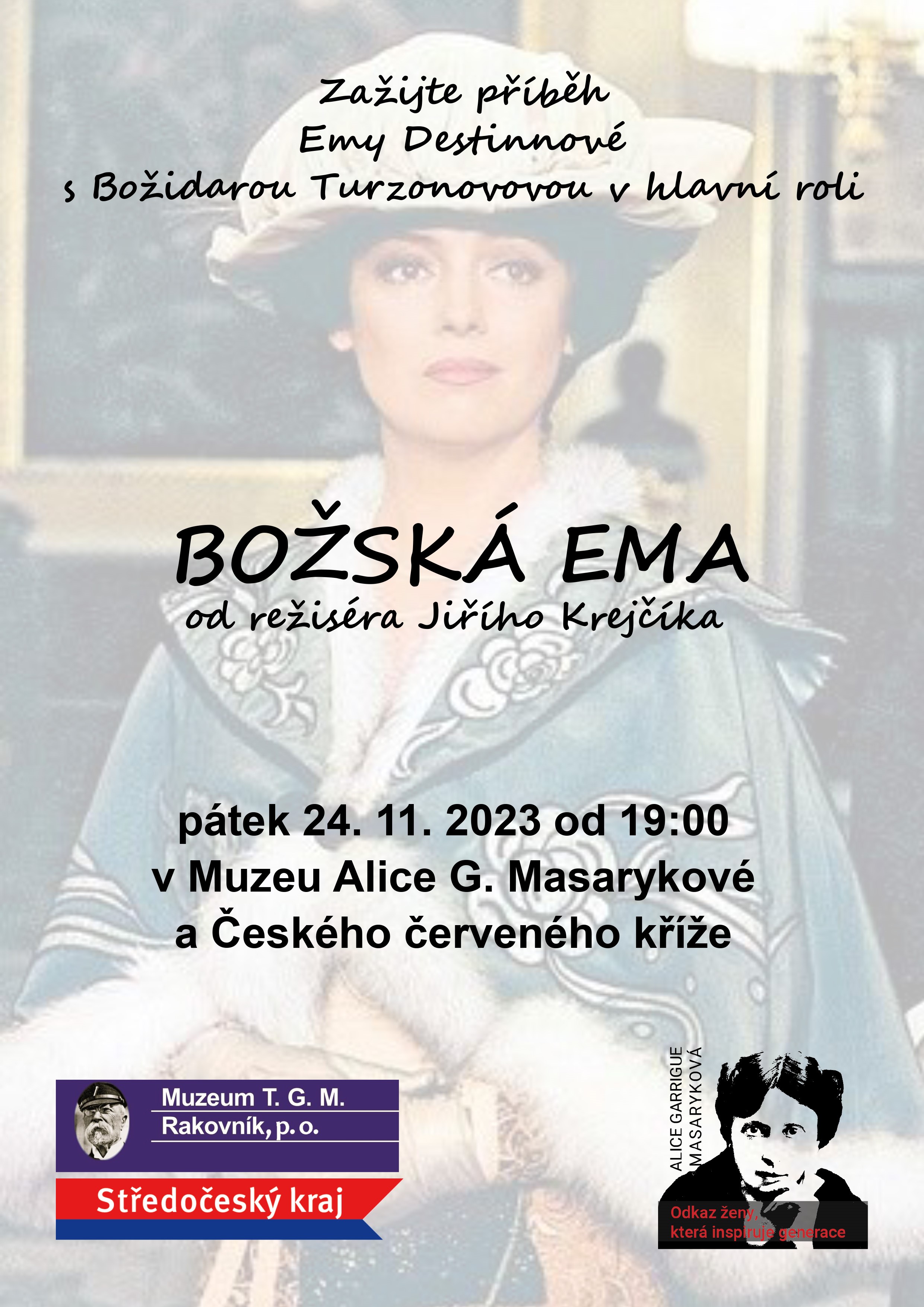 V rámci Cyklu „Alice Garrigue Masaryková - odkaz ženy, který inspiruje generace“ vás srdečně zveme na další akci do Muzea Alice G. Masarykové a ČČK v Lánech, tentokrát na promítání českého životopisného filmu Božská Ema (1979) scenáristy Zdeňka Mahlera a režiséra Jiřího Krejčíka, který byl volně inspirován významnou epizodou ze života světoznámé české operní pěvkyně Emy Destinnové. V hlavní roli Božidara Turzonovová.