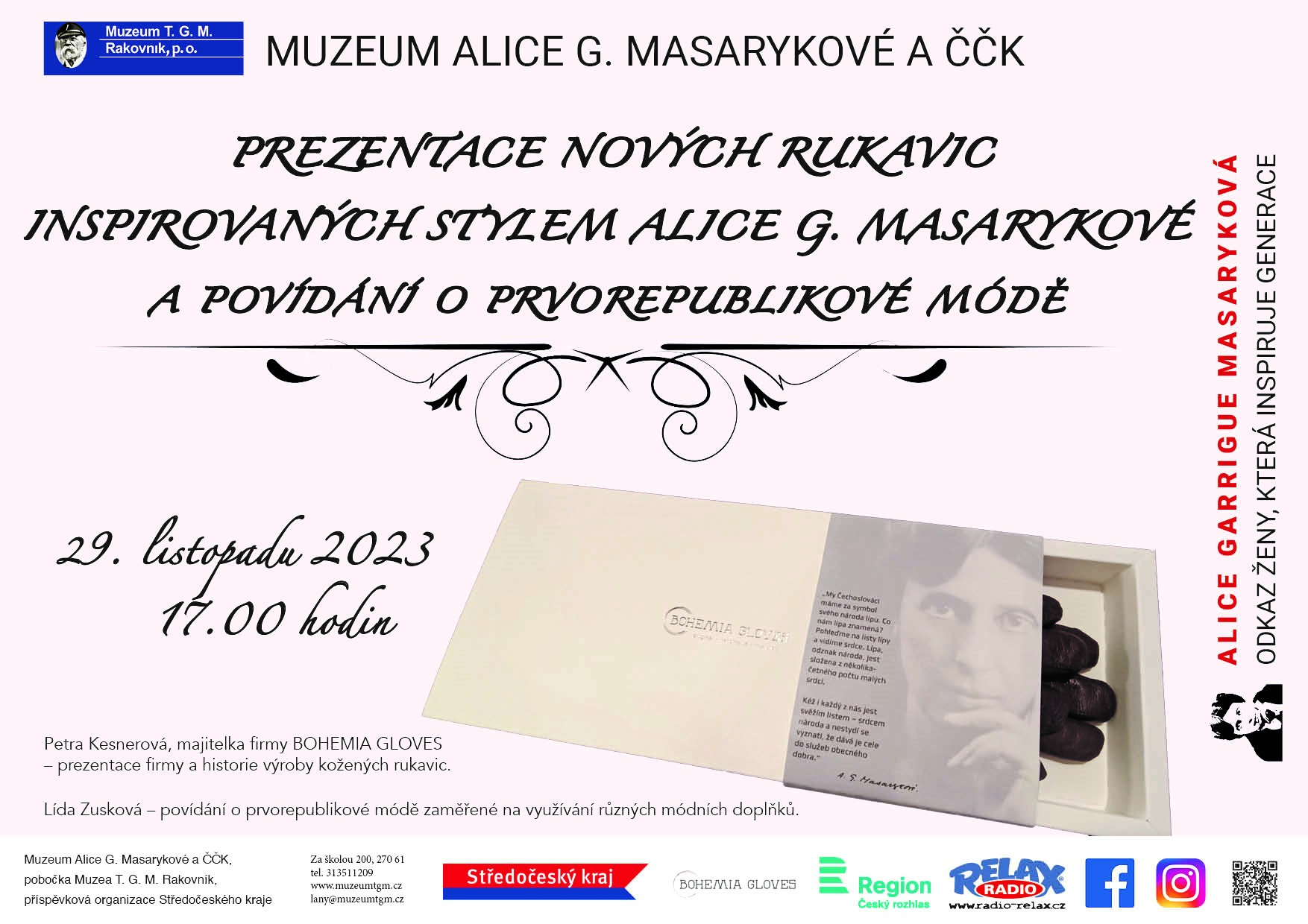 Představení rukavic se uskuteční ve středu 29. listopadu 2023 od 17 hodin v Muzeu Alice G. Masarykové a ČČK v Lánech, Za Školou 200, Lány