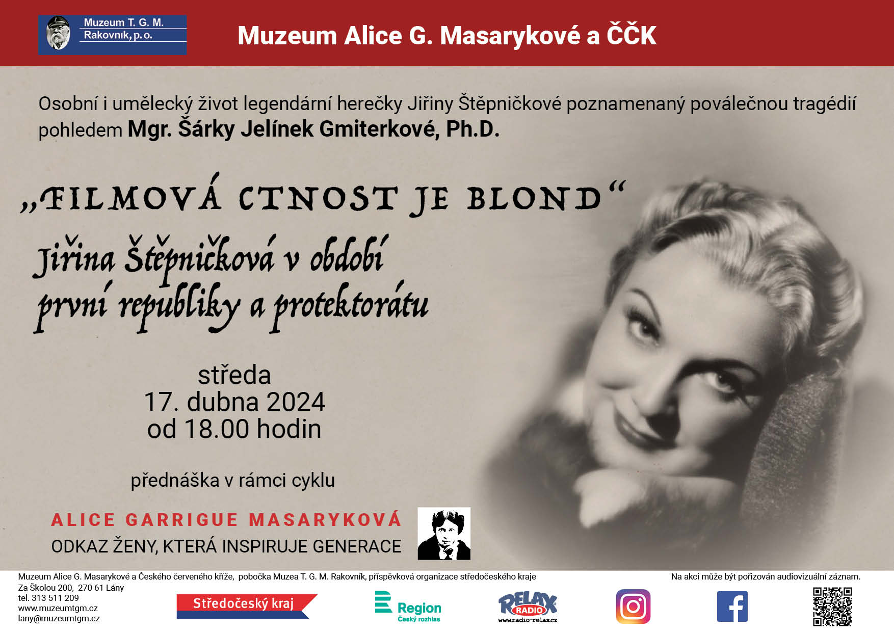 Přednáška s názvem "Filmová ctnost je blond" – Jiřina Štěpničková v období první republiky a protektorátu se koná rámci Cyklu „Alice Garrigue Masaryková - odkaz ženy, který inspiruje generace“. Mgr. Šárka Jelínek Gmiterková, Ph.D. představí herečku Jiřinu Štěpničkovou, jednu z nejzářivějších hvězd tuzemské kinematografie 20. století. Vynikla v rolích morálně pevných a ctnostných venkovských žen, naopak jen výjimečně dokázal film využít její komediální talent. Ztělesňovala v domácím prostoru ojedinělý typ filmové star, která kontinuálně stavěla na hloubce svého hereckého talentu, ale i jasně rozpoznatelném typu a fyzické kráse. Ve finále se společně zamyslíme nad důvody, které vedly k jejímu vytěsnění z československé kultury i k jejímu uvěznění v roce 1951.