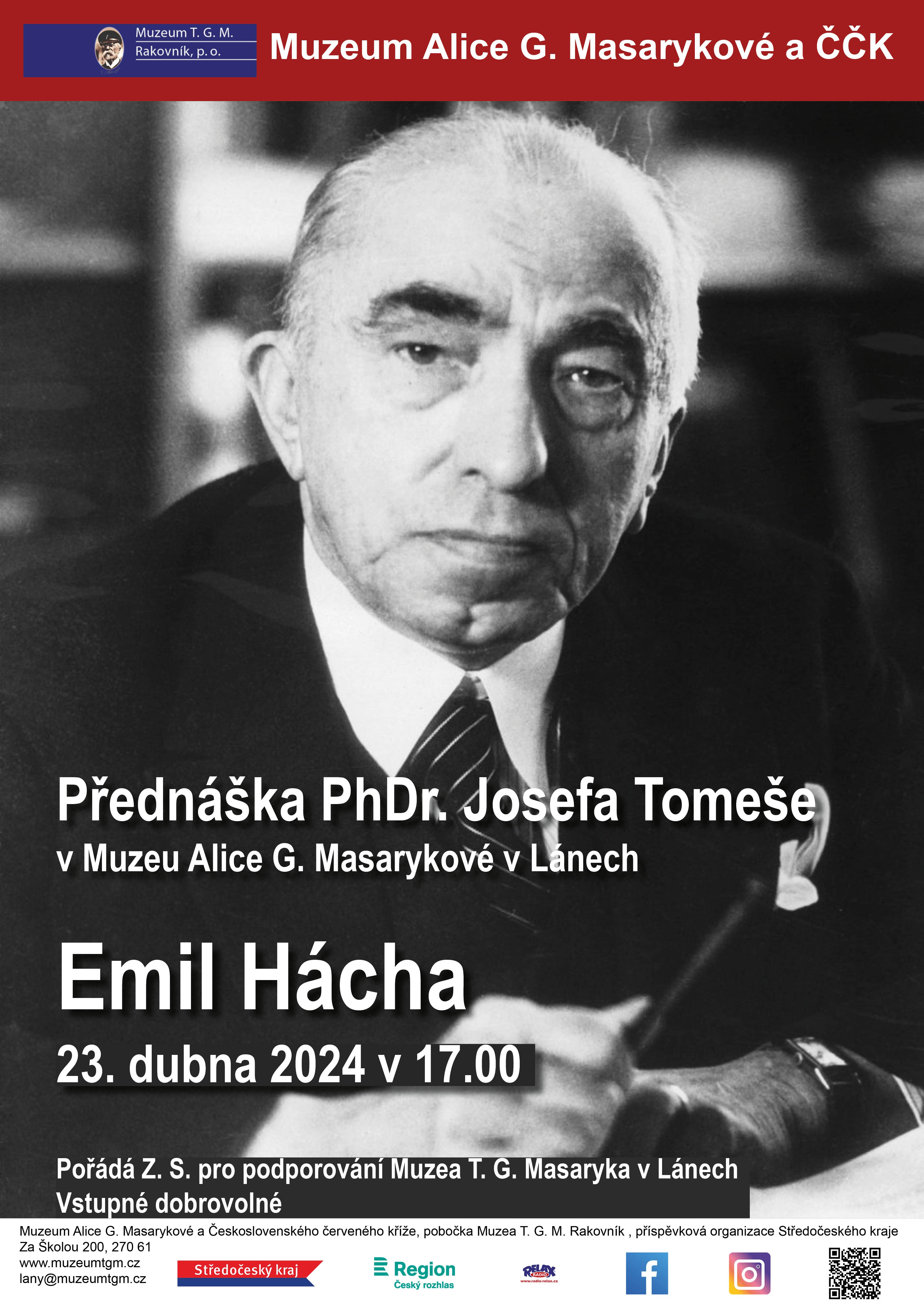 zveme do Muzea Alice G. Masarykové a ČČK v Lánech na přednášku PhDr. Josefa Tomeše – Emil Hácha.