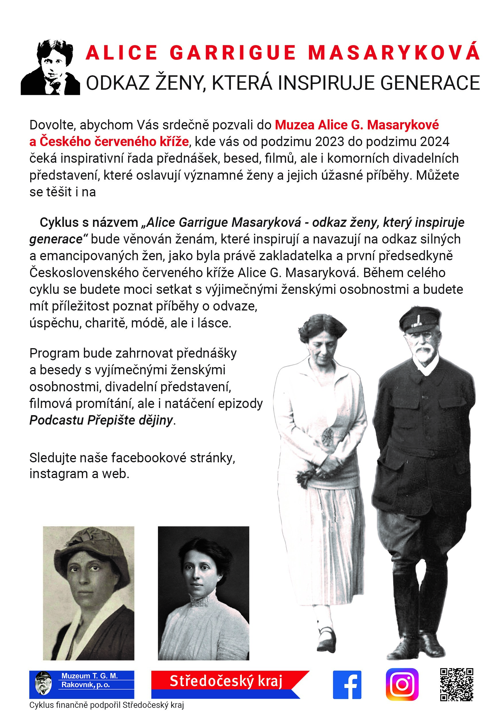 Cyklus s názvem „Alice Garrigue Masaryková - odkaz ženy, který inspiruje generace“ bude věnován ženám, které inspirují a navazují na odkaz silných a emancipovaných žen, jako byla právě zakladatelka a první předsedkyně Československého červeného kříže Alice G. Masaryková. Během celého cyklu se budete moci setkat s výjimečnými ženskými osobnostmi a budete mít příležitost poznat příběhy o odvaze, úspěchu, charitě, módě, ale i lásce.