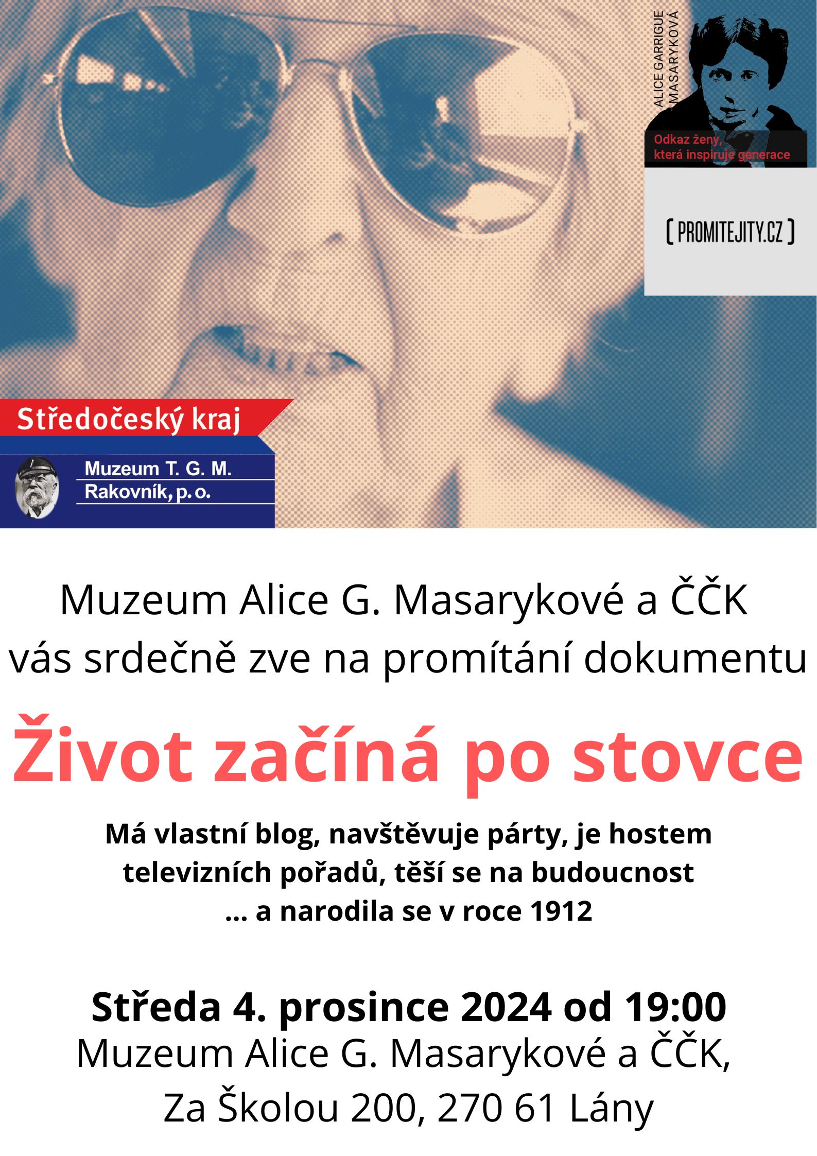 Muzeum Alice G. Masarykové a Českého červeného kříže v Lánech vás v rámci Cyklu „Alice Garrigue Masaryková - odkaz ženy, který inspiruje generace“ srdečně zve na promítání filmu Život začíná po stovce.